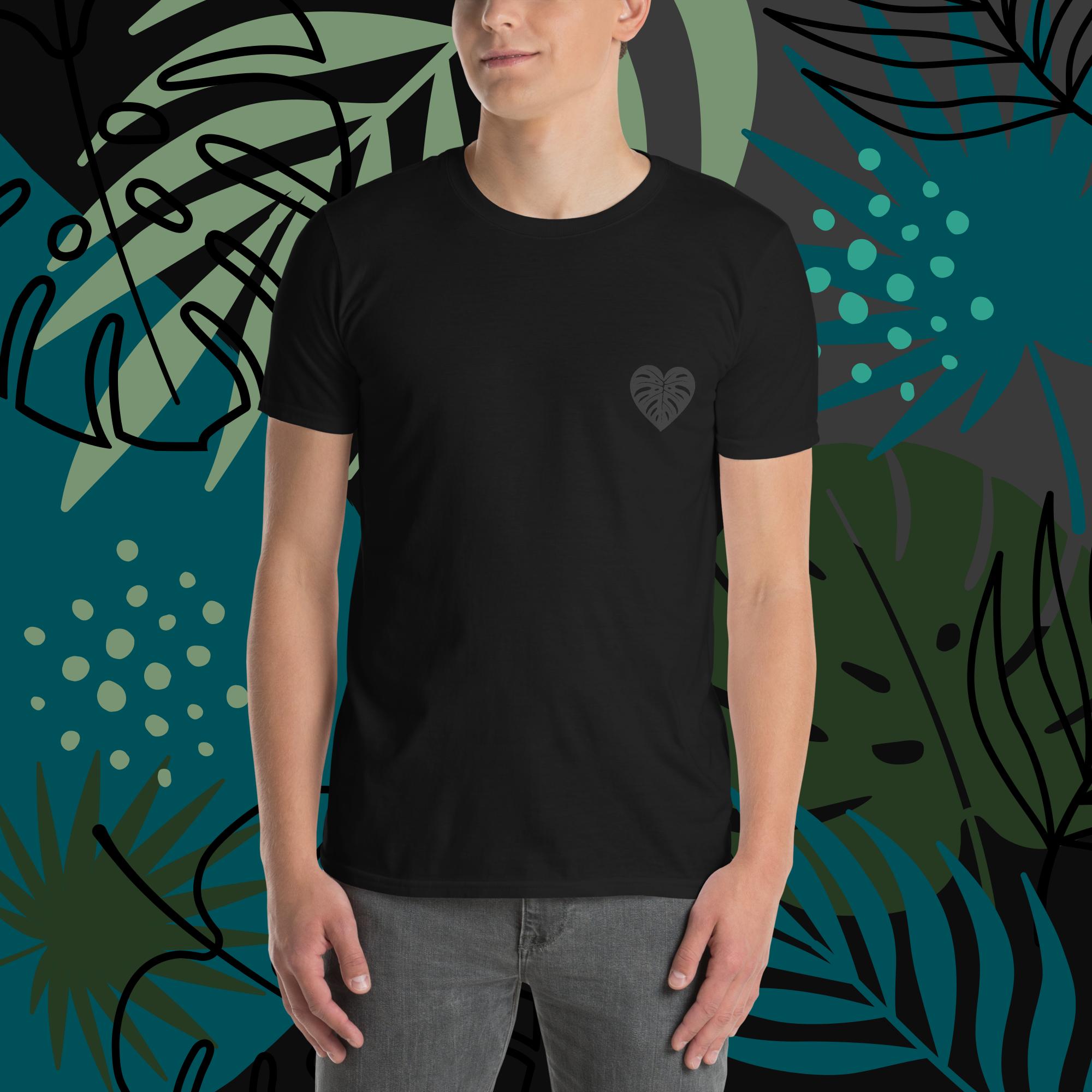 A crisp black tee with a tone-on-tone  leaf logo — barely there, but impossible to miss once you notice it. Calm energy only.